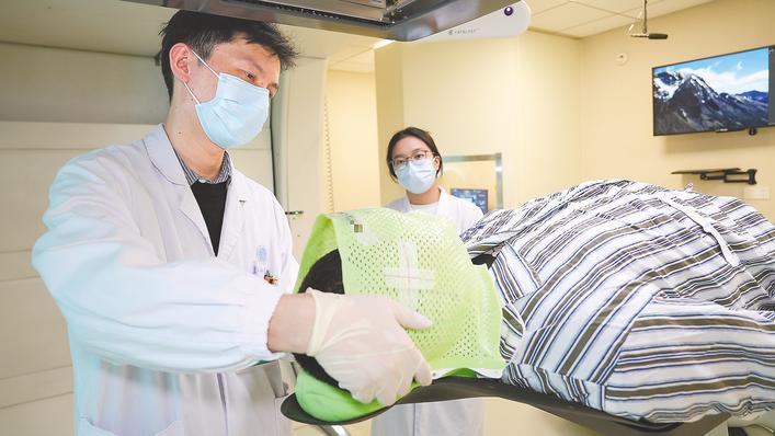 仁安医院质子医学中心的医生在质子放射治疗前为患者做好体位准备。 (湖北日报通讯员 刘坤伟 摄)