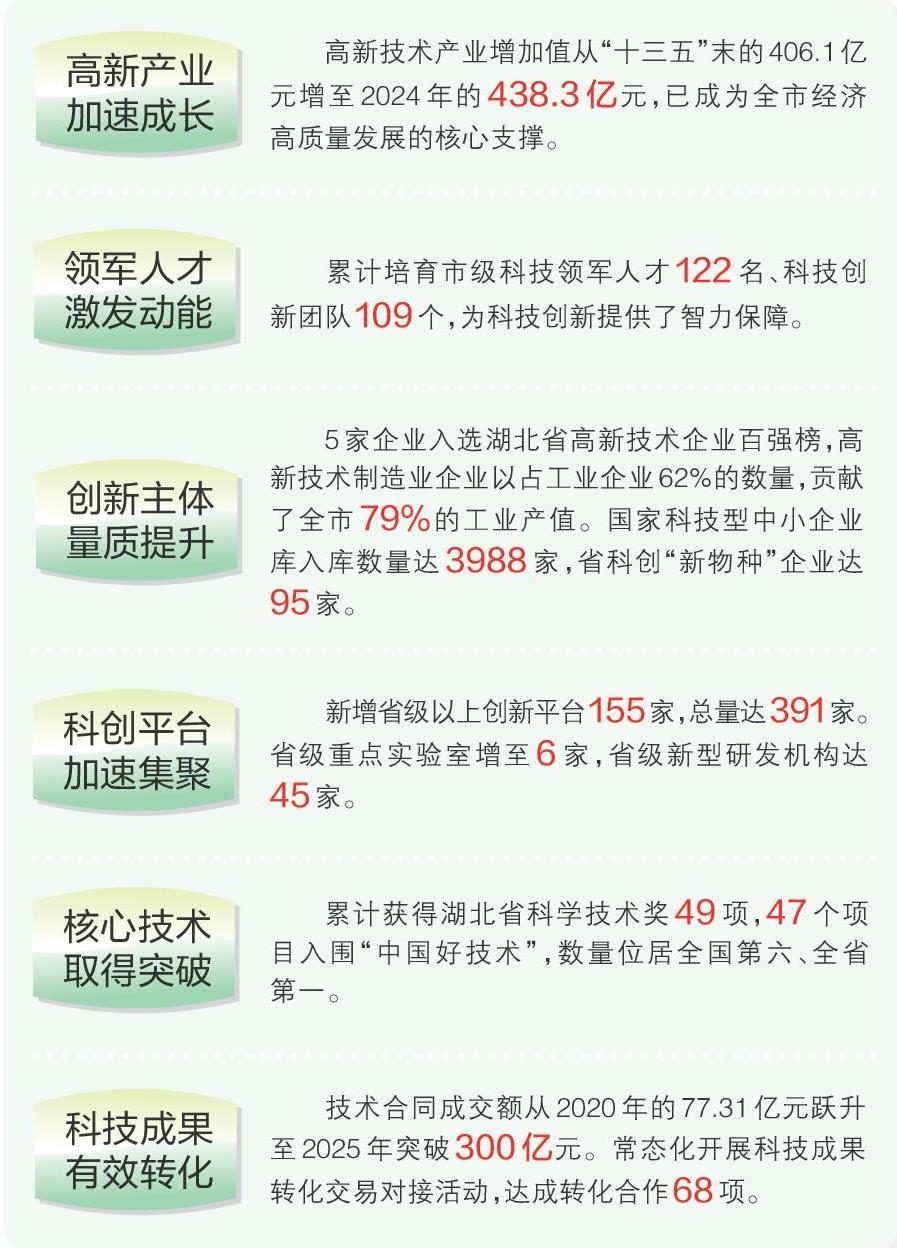 “十四五”期间,我市在关键技术领域取得一系列突破。支持科技企业开展氢重卡车、智能驾驶、钠离子电池等一批国家和省重大科技项目。共获得湖北省科学技术奖49项,47个项目入选“中国好技术”,位居全国第六、全省第一。科技成果转化效率大幅提升,技术合同交易额从77.31亿元跃升2020年到2025年将超过300亿元。